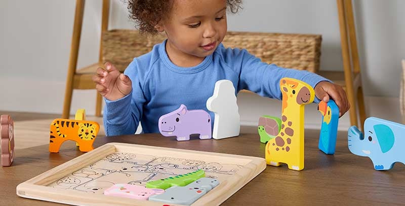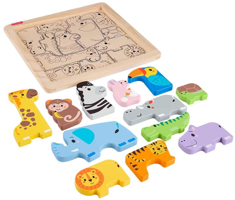 The Fisher-Price Wooden Animal Puzzle offers wild shape-sorting and storytelling fun for toddlers. Made with wood from Forest Stewardship Council-certified sources (FSC-N004566) and decorated with non-toxic, water-based paint, this wooden puzzle includes 12 animal-themed blocks that kids can sort into the puzzle tray or stand upright for storytelling play. The convenient storage tray features guidelines to help kids sort the animals into the corresponding slots on their own. Colors and decorations may vary.