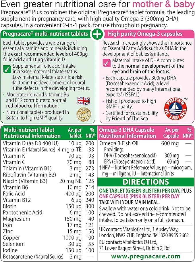 Pregnacare Plus Tablets with Omega 3 has been carefully developed to help safeguard your dietary needs from pre-conception, during pregnancy and through to the end of breastfeeding and can be taken at any point during pregnancy.